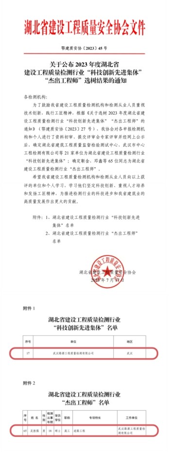 祝賀!市政設(shè)計(jì)院所屬路源公司及員工榮獲2023年度湖北省建設(shè)工程質(zhì)量檢測(cè)行業(yè)“科技創(chuàng)新先進(jìn)集體”、“杰出工程師” 稱號(hào)。