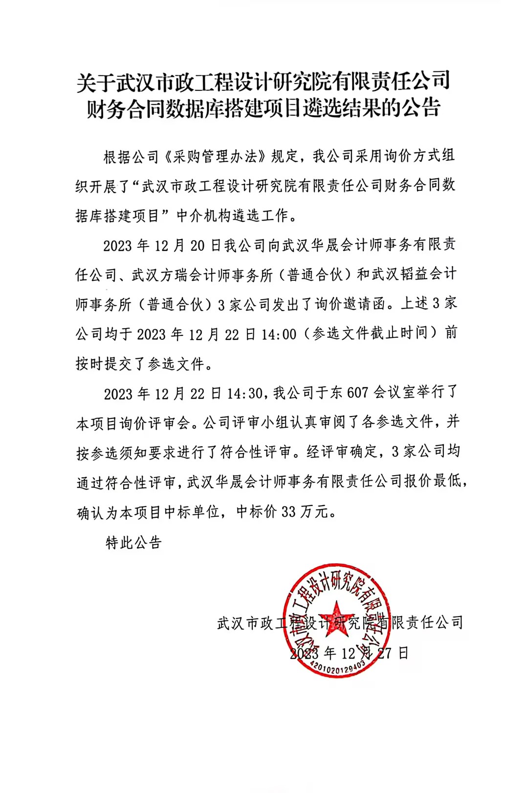 關(guān)于武漢市政工程設(shè)計(jì)研究院有限責(zé)任公司財(cái)務(wù)合同數(shù)據(jù)庫(kù)搭建項(xiàng)目遴選結(jié)果的公告