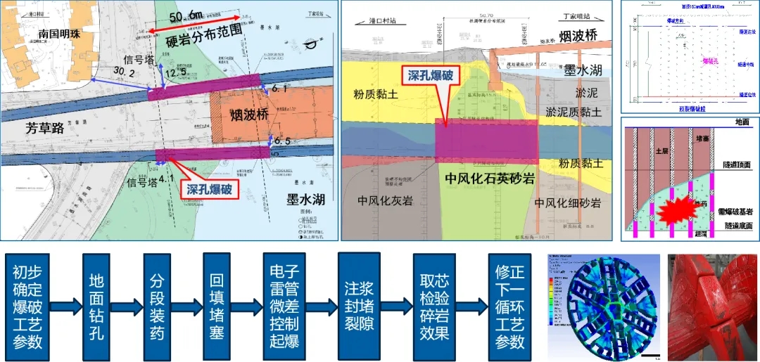 獲獎項目《地鐵隧道穿越極硬巖的新方法研究》是依托于武漢地鐵12號線港口村站至丁家咀站區(qū)間隧道工程。本項目存在隧道水下穿越強度高達251MPa極硬巖的復雜地質(zhì)和周邊有橋梁、建筑等敏感環(huán)境兩大難題,實驗團隊歷經(jīng)近兩年的方案研究和工程實踐,創(chuàng)新性地提出了解決方案:采用控制爆破技術對極硬巖進行預處理,有效降低盾構(gòu)機掘進的難度,同時在爆破過程中采取相應的減隔震技術,保障周邊橋梁、房屋和市政管線等建構(gòu)筑物的安全。這一新技術極大地降低盾構(gòu)機掘進通過極硬巖的難度,提高了施工效率,大幅減少了工程成本,實現(xiàn)了良好的社會和經(jīng)濟效益。