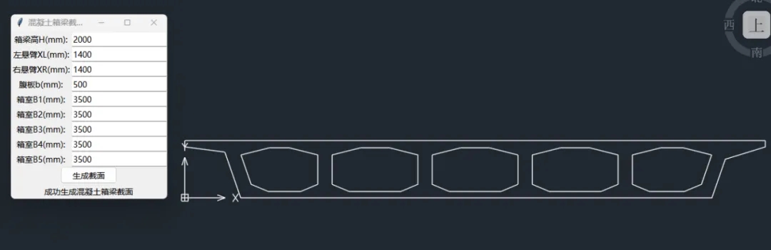 ? ? 武漢市政院實(shí)踐了多模態(tài)技術(shù)融合路徑——依托DeepSeek大模型深度工程語(yǔ)義理解與智能代碼生成框架,將混凝土箱梁截面的幾何參數(shù)標(biāo)準(zhǔn)、CAD二次開發(fā)規(guī)范等專業(yè)知識(shí)注入大模型認(rèn)知體系,使其生成代碼框架。經(jīng)過(guò)多輪調(diào)試,開發(fā)出參數(shù)化生成混凝土箱梁截面的小插件,能夠?qū)崿F(xiàn)箱梁高度、懸臂長(zhǎng)度、腹板寬度、箱室寬度等參數(shù)的設(shè)定,并配備可視化界面。