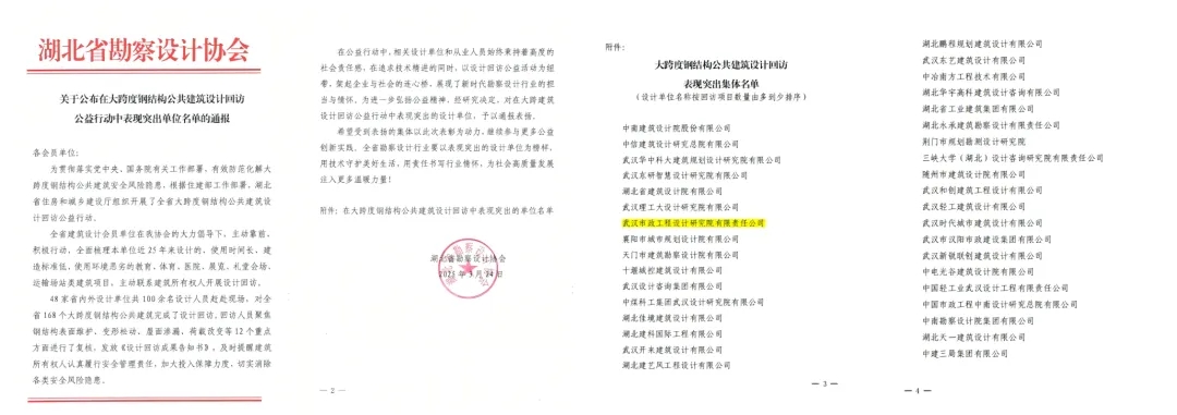近日,湖北省勘察設(shè)計(jì)協(xié)會(huì)發(fā)布《關(guān)于公布在大跨度鋼結(jié)構(gòu)公共建筑設(shè)計(jì)回訪(fǎng)公益行動(dòng)中表現(xiàn)突出單位名單的通報(bào)》,武漢市政院憑借高度的社會(huì)責(zé)任感與卓越的專(zhuān)業(yè)貢獻(xiàn),榮列通報(bào)表?yè)P(yáng)名單,成為全省勘察設(shè)計(jì)行業(yè)的標(biāo)桿典范。