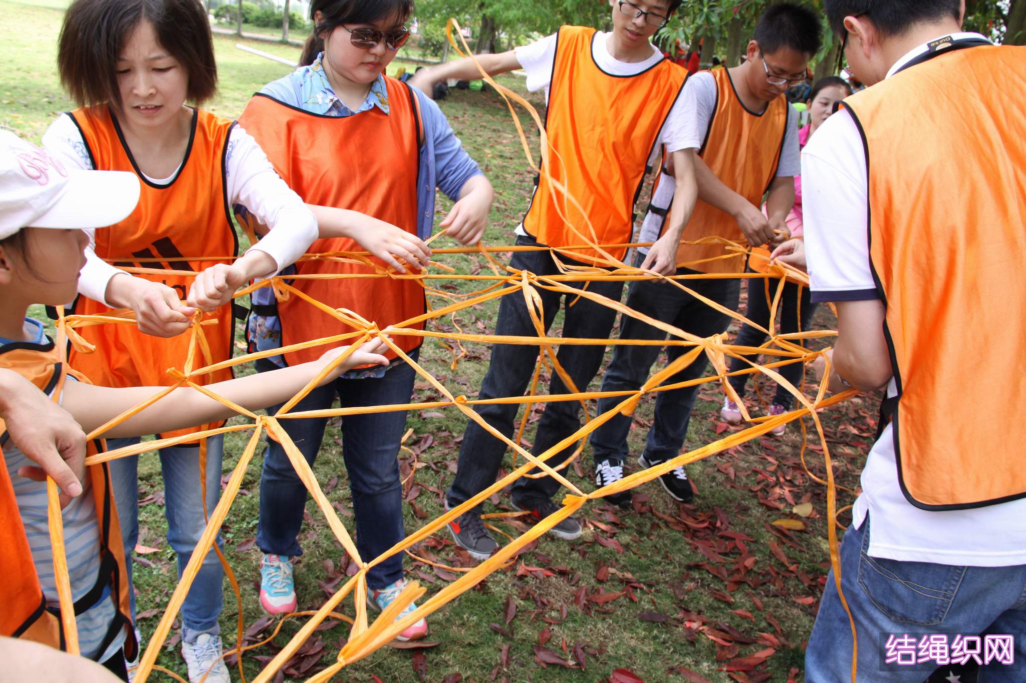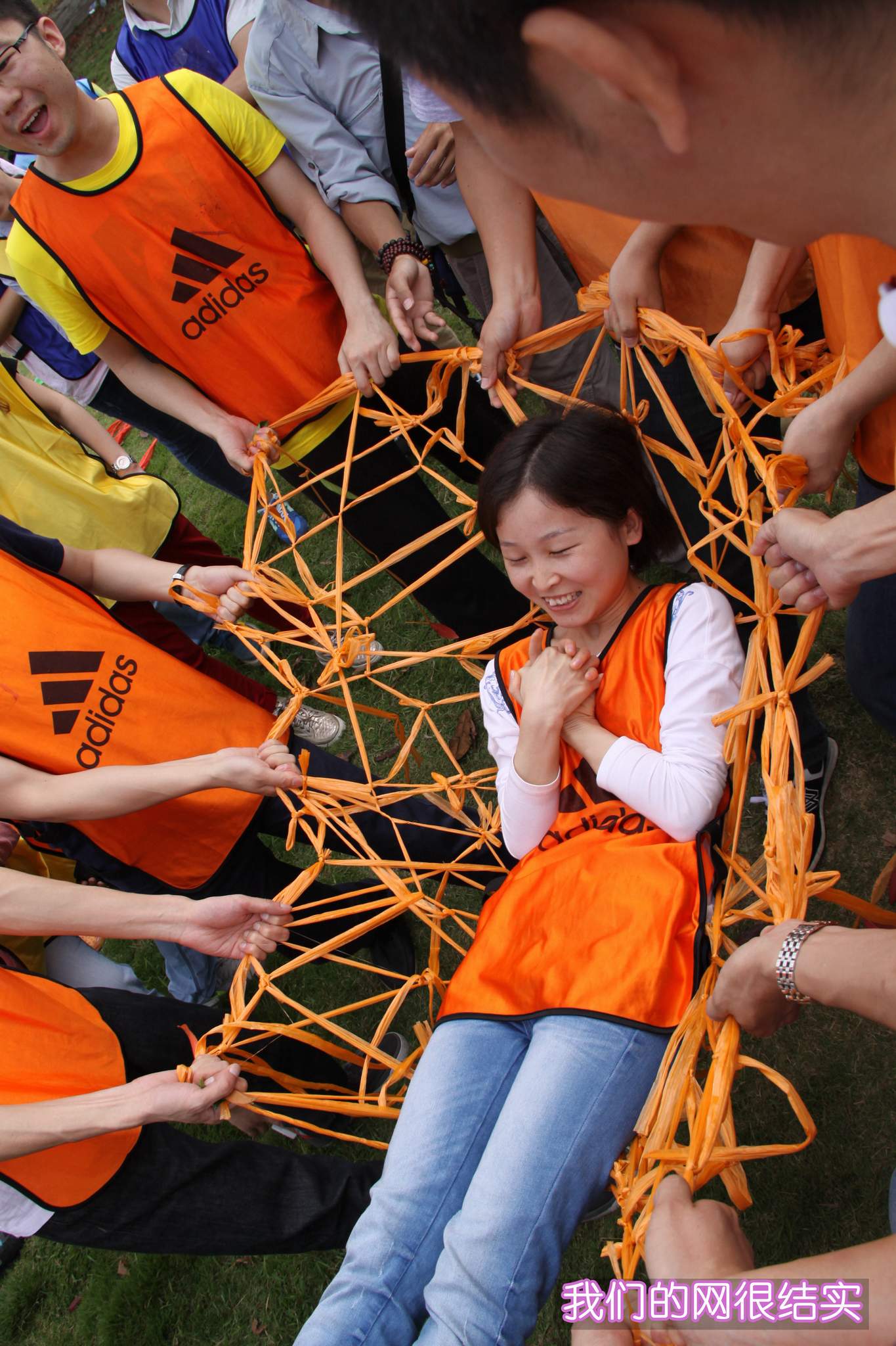 ??? 在第二個(gè)項(xiàng)目中,隊(duì)員們要用一捆塑料繩編織成網(wǎng),并要能承受一個(gè)人的重量。隊(duì)員們紛紛開(kāi)動(dòng)腦筋,一齊動(dòng)手,很快便完成了任務(wù)。各支隊(duì)伍采用的編制方法不同,形狀也不同,但都能承受起一個(gè)人的重量,可以說(shuō)不分伯仲。