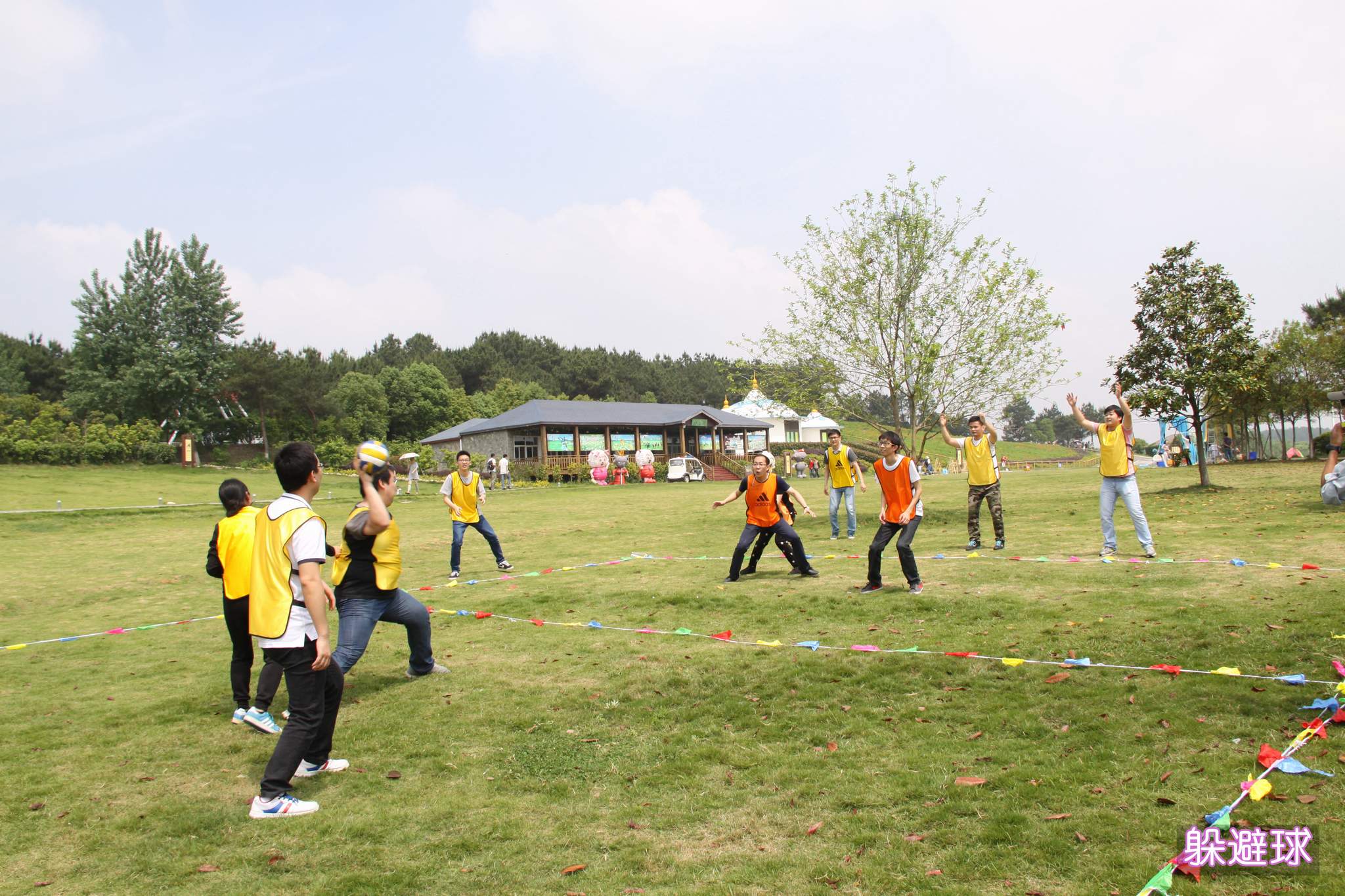 ??? 上午的最后一個(gè)項(xiàng)目是“躲避球”,每支隊(duì)伍選派1名女隊(duì)員和6名男隊(duì)員參賽,比賽雙方用排球向?qū)Ψ酵稊S,先擊中女隊(duì)員的一方獲勝,這個(gè)項(xiàng)目考驗(yàn)的是隊(duì)伍的團(tuán)隊(duì)精神和奉獻(xiàn)精神,而隊(duì)員們也都很好的完成了挑戰(zhàn)。