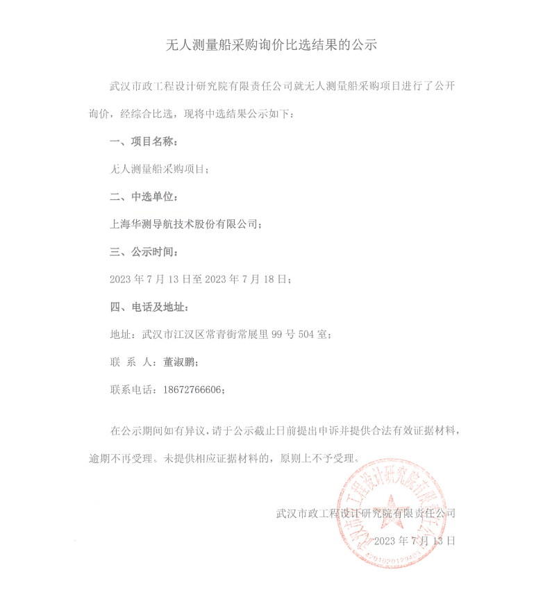 無人測量船采購詢價比選結(jié)果的公示